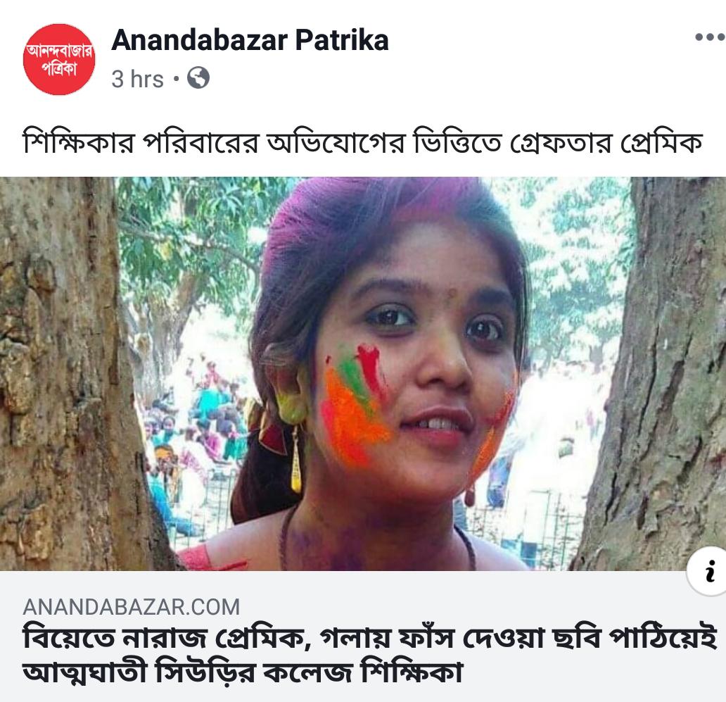 Subhra Mondal ….guest lecturer of Vidyasagar college …Suri Birbhum ..commited suicide by hanging herself yesterday due to break up of relation with Suman Chatterjee.who is also a meritorious student ..Both of them just completed their b.ed from Prabhat jyotirmoyee educational research institute Suri Birbhum on session 2017_19.The couple had spent so many good time but negotiation was not solemnized because of career of Sumon.